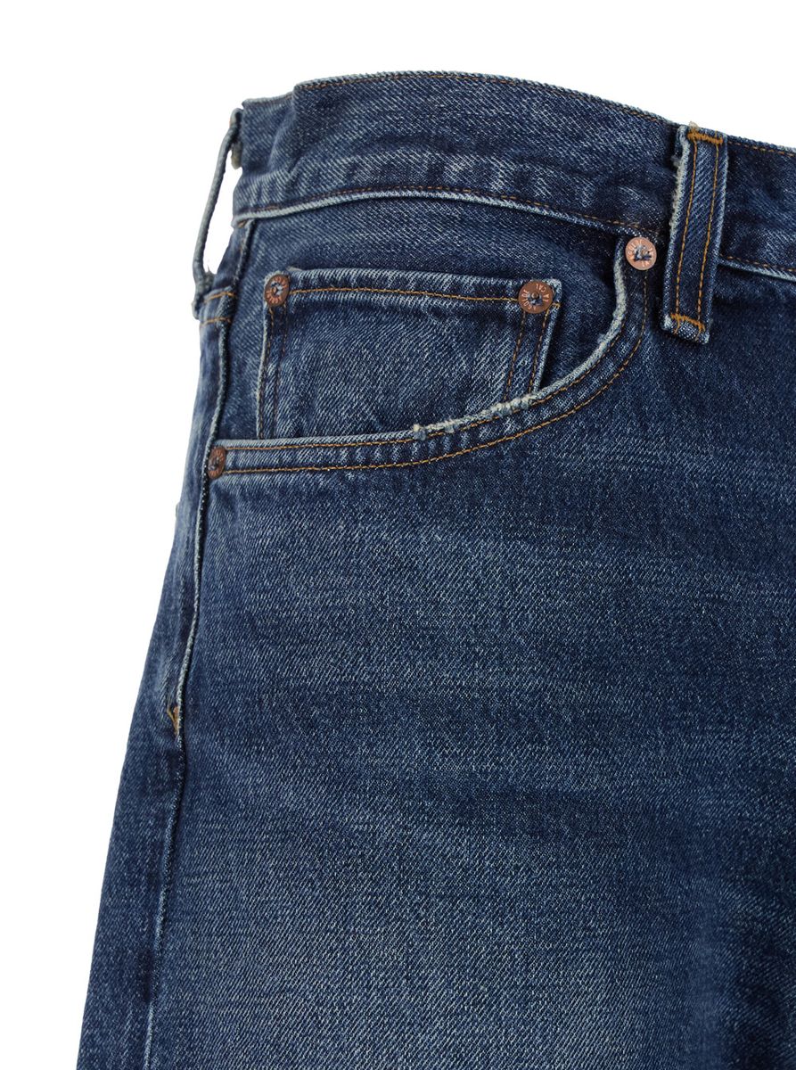 Belt loops, button and zipper closure concealed by flap, five-pocket model