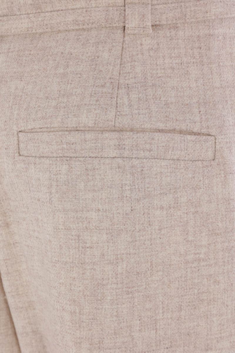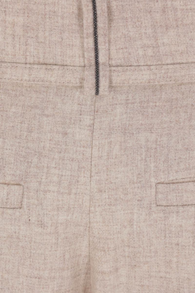 Brunello Cucinelli wide-leg trousers made of beige wool and cashmere. Featuring front closure with hook, button, and zip, belt loops with a matching belt, multiple pockets, front darts, and a central crease. The design is completed with monile embroidery on the rear belt loop.