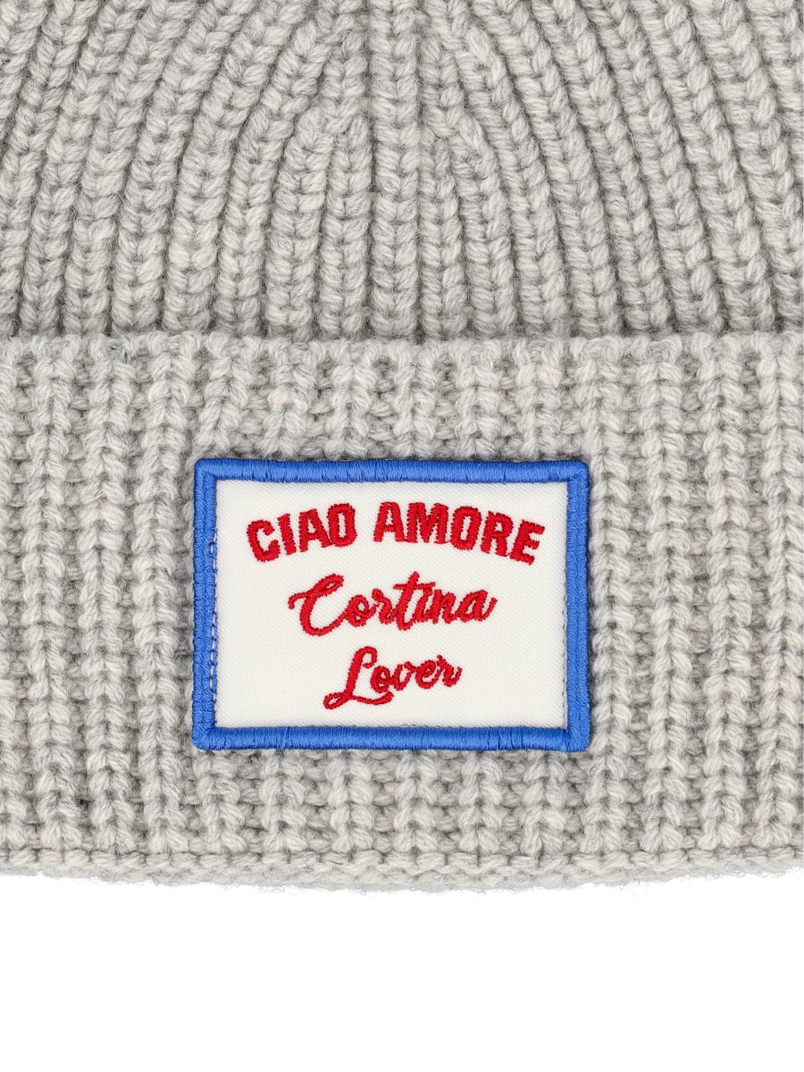 This Giada Benincasa signature hat is the perfect accessory to combine style, irony and warmth during the cold season. Made from a fine blend of merino wool and cashmere, it ensures comfort and softness, while the wide rib design and lapels add a classic, timeless touch. The embroidered "HELLO LOVE Cortina Lover" detail on the colorful front patch lends personality and evokes the holiday mountain spirit with a pop, contemporary twist. A unisex, versatile and easy-to-match style to complete winter looks with a distinctive twist. - Composition: 90 percent fine merino wool, 10 percent cashmere - Color: light grey - Workmanship: wide ribbed knit with lapels - Detail: front patch with embroidered "HELLO LOVE Cortina Lover" - Made in Italy - Item code: F25EM2831K38