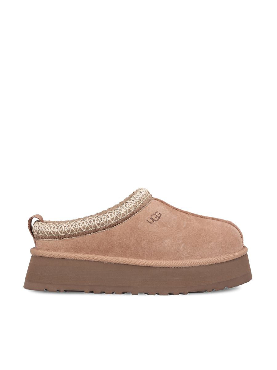 The Tazz II combines the practicality of a slipper and the versatility of a casual shoe, while maintaining the comfort that has made the Tazz iconic. The smooth suede upper is paired with a soft sheepskin lining, while the lightweight and durable sugarcane EVA sole features a convex design that accompanies every step. UGGbraid detail, made from recycled polyester fibers, and a 4.4-cm platform add a distinctive, modern touch. - Upper: smooth suede - Lining: sheepskin (10 mm) - Insole: sheepskin (10 mm) - Outsole: sugarcane EVA - Midsole: EVA - Edge: 100% recycled polyester fabric - Color: Sand - Decoration: UGGbraid made of recycled polyester fibers (100%) - Logo: UGG® hot-embossed + UGG® logo fabric label on the insole - Fur origin: sheep or lamb from Australia, Ireland, the UK or the US - Treatment: artificial dye and treatment - Box included - Item number: 1174471RYK